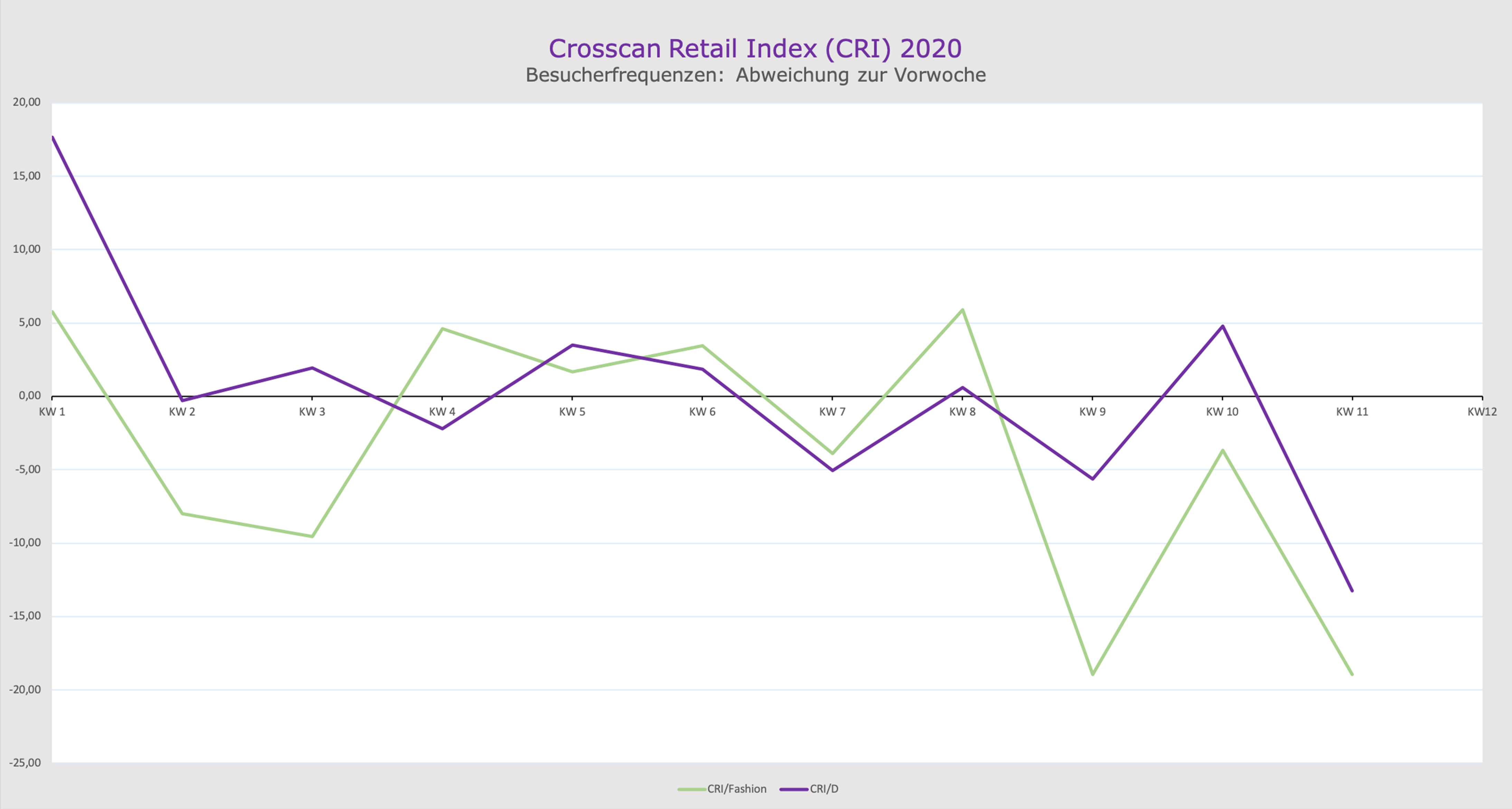 Crosscan Retail Index: Covid-19 verstärkt Frequenzrückgang in deutschen Innenstädten bereits seit der 11. KW